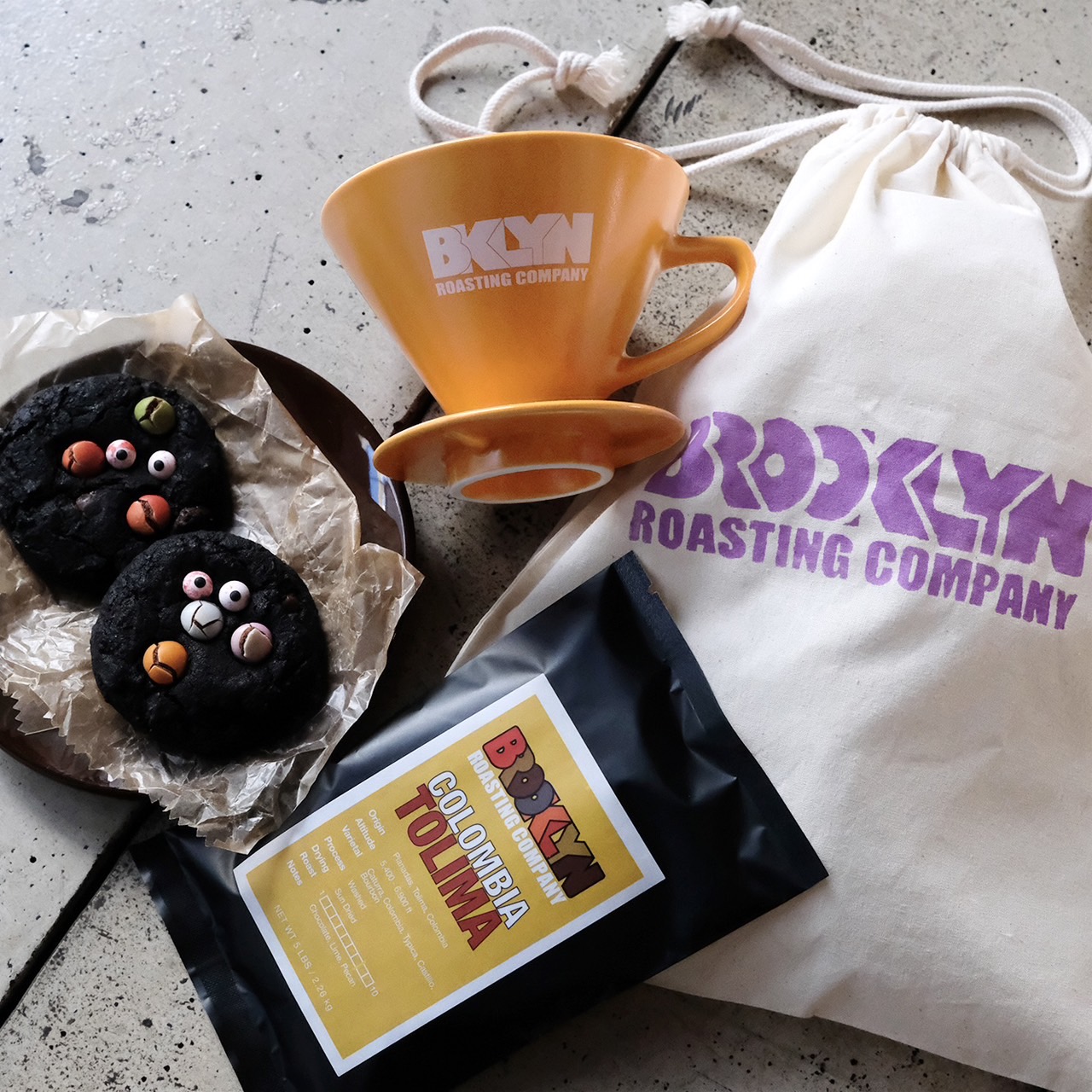 BRCのコーヒーが簡単に手軽にお楽しみいただけるDRIP BAG3つとBRCオリジナルDINER MUG、クッキーの生地にブラックココアを使用したちょっぴりホラーで可愛いチャンククッキーのセット。