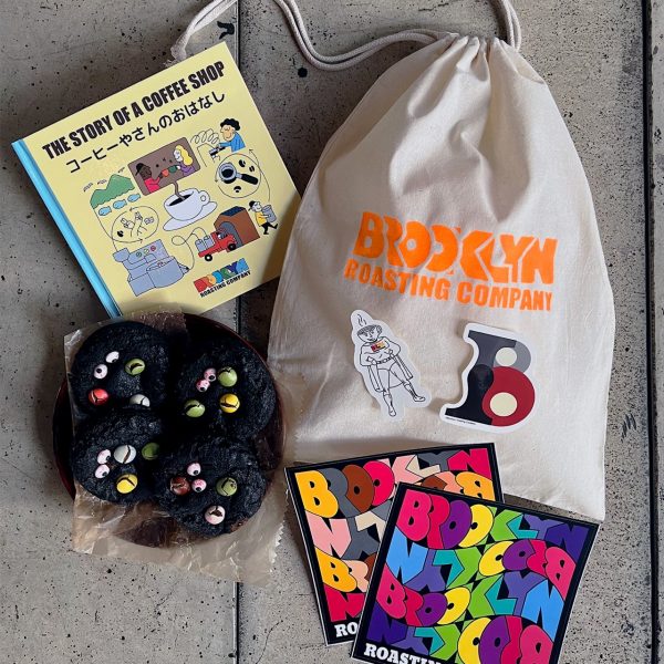 BRCのコーヒーについて大人も子供も楽しみながら学べる絵本、BRCのオリジナルステッカー4種、クッキーの生地にブラックココアを使用したちょっぴりホラーで可愛いチャンククッキーのセット。